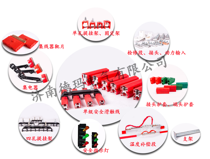 集電器、靴片、靴盒、螺栓、接頭護套、端頭護套、固定架、提掛架、端頭護套、支架、動力輸入、檢修段、溫度補償器、接頭、信號指示燈等配件構成。