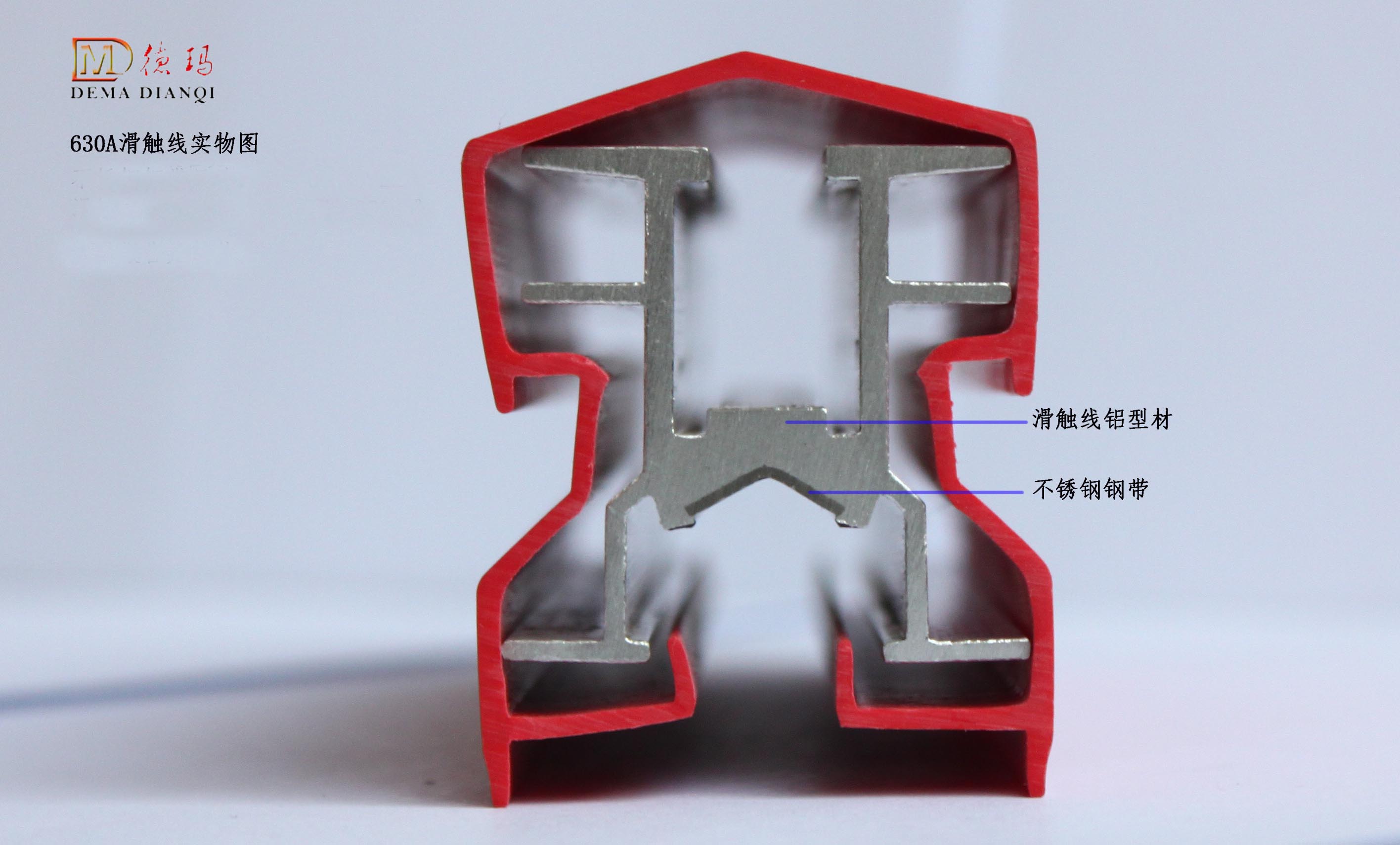 產(chǎn)品如圖,該種類型產(chǎn)品為單極安全滑觸線,電流大小為630A。圖片左上角為濟(jì)南德瑪商標(biāo)標(biāo)識(shí),一般在紅色外殼上面有噴碼作防偽。滑觸線鋁型材為滑觸線主要導(dǎo)電部分,目前濟(jì)南德瑪滑觸線主要采用H型鋁型材,材質(zhì)為6101,該材質(zhì)導(dǎo)電性能好,不易變形,使用壽命長久。不銹鋼鋼帶主要起到防磨作用,提高滑觸線的使用壽命。目前濟(jì)南德瑪滑觸線的不銹鋼鋼帶采用304牌號(hào),該牌號(hào)的不銹鋼鋼帶,耐腐性好、導(dǎo)電性能好、使用壽命長久。紅色外殼為PVC外殼,起到保護(hù)滑觸線導(dǎo)體,并防護(hù)外部人員觸電。